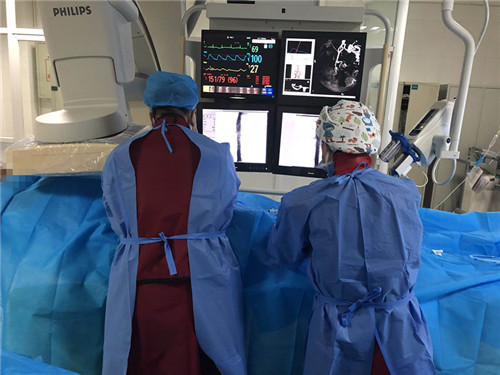 全体介入医护人员集结到位,做好详尽的抢救预案和准备,晚6点20分患者进入介入手术室:经右侧股静脉穿刺行下腔静脉滤器置入术(肾静脉平面下)后,穿刺左侧大隐静脉成功后出现回血正常但推注困难。李建国主任当机立断调整手术方案,立即穿刺右侧股动脉留置导管于左侧股动脉中远端,通过动静脉血液交换保证静脉顺行性溶栓治疗,术后固定穿刺鞘组及导管,医护人员全程护送患者安返病房。和临床医护人员详细交接用药剂量和方法及注意事项,给予动脉留置导管24小时缓慢泵入肝素钠(全身肝素化)+尿激酶溶栓治疗,同时对患者肿胀肢体进行积极有效的护理干预,尽快消肿恢复左下肢静脉通路,以保证拔除右侧股动脉鞘组及留置导管后,静脉顺行性溶栓用药的持续进行。患者在治疗24小时后左下肢皮肤张力明显下降、皮肤颜色及肿胀明显缓解,左足背动脉亦可触及,7天后双侧髌骨下缘周径缩小了约5cm,髌骨上缘缩小了约8cm。介入科白小爱护士长穿刺左侧大隐静脉成功确保结扎肢体后推注通畅,保证溶栓药物的顺利应用,再拔除右股动脉留置导管及鞘组并加压包扎穿刺伤口。