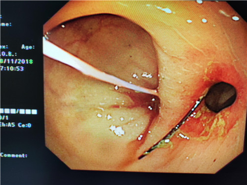 在检查过程中,当曹鹏主治医师将内镜进至吻合口狭窄处时,却偶然发现狭窄部位旁边还有一小小入口,探镜而入,发现这条小小隧道与狭窄部一同通向肠腔,中间相隔了一条不宽不窄的“桥梁”,把本来通畅的“大路”隔成了两条幽径小道,因此患者排便才会堵塞不通。经过反复观察,仔细斟酌后曹鹏医生萌生了,把“桥梁”拆掉,使“曲径小路”变“宽敞大道”的想法。因为这时如果按原计划行肠镜下吻合口扩张术已经没有太大的意义,但肠道薄弱容易造成穿孔,“桥梁”处是否有大的血管,存在出血、穿孔的风险等等,这些都需要与主管医生进一步探讨。随即他与普通外科史和平主任,消化内镜室王莹主任会诊后决定实施“粘膜桥离断术”(ESD内镜下粘膜剥离术)。将术中风险及意外向患者及家属充分告知后,征得患者家属同意签字,随后便开始施行手术。在史主任、王主任、李侠护士长的支持保驾护航之下,曹鹏医生以精湛的医疗技术,与护士的默契配合,顺利完成了手术,术中无出血、穿孔,眼前显示器屏幕上出现了预期中的“宽敞大道”,手术成功了!大家原本绷紧的面容出现了笑容。患者从此以后不会再有排便不畅的痛苦了,患者唐某及家属,欣喜及感激之情溢于言表,医生们再一次为他解决了一件大事情,患者术后恢复良好。