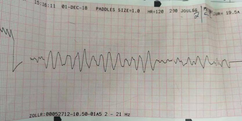 抢救中,患者突然发生室颤,立即电除颤,再次室颤,再次电除颤。经过2次电除颤、持续胸外按压、应用抢救药物等抢救治疗后约10分钟,患者神志好转、恢复窦性心律及自主呼吸、颜面口唇转红润、瞳孔较前回缩,对光反射灵敏。