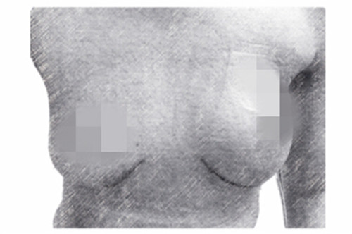 患者女性,49岁,2年前因乳腺癌行“保留乳头乳晕的皮下腺体切除+腋窝淋巴结清扫+ I期软组织扩张器植入手术”,术后进行了规范的辅助化疗、放疗及内分泌治疗。本次住院检查,患者全身情况良好无肿瘤复发及转移,经与患者及家属沟通,有二期乳房重建的意愿及适应症。经过精心的术前准备,为患者实施了“扩张器取出,二期假体植入乳房重建手术”。