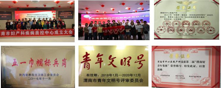 近年来,产科先后荣获陕西省“好青年集体”、陕西省文卫体系统“五一巾帼标兵岗”、省级首批临床重点专科、“陕西省优质护理先进科室”“渭南市第二届好青年集体”、“渭南市青年文明号”等荣誉。