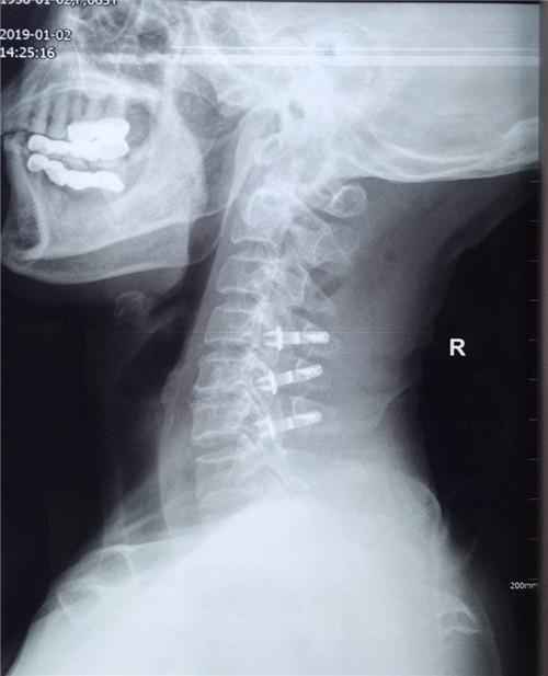 患者入院后,骨一科医护人员为其做进一步检查,诊断为多发颈椎间盘突出并继发颈椎管狭窄症。经讨论研究后,程福宏副主任医师决定为其行颈后路颈4、5、6的单开门椎板扩大成形术,该手术在王小峰主治医师的配合下完成。术中,医生为患者进行彻底的减压脊髓,固定椎板。术后患者恢复较好,症状改善明显,已能够独自行走,恢复正常活动。