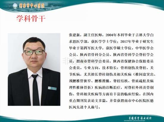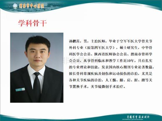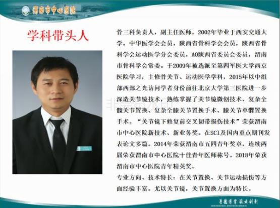 骨三科暨骨关节科设置床位15张,医护人员13名,硕士研究生3名,是以关节疾病为主,涉及关节病、运动医学及关节周围骨折,老年脆性骨折为亚专业特征的学科。科室现已开展骨关节病的阶梯式治疗,擅长重度关节疾病的髋、膝关节置换,能熟练开展膝、肩、肘、踝关节镜手术。我们将以一流的技术,优质的服务为全渭南乃至全省广大关节疾病患者的身心健康服务。