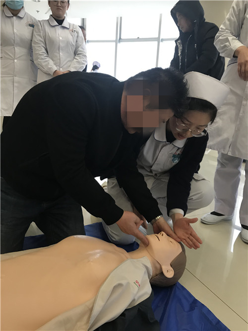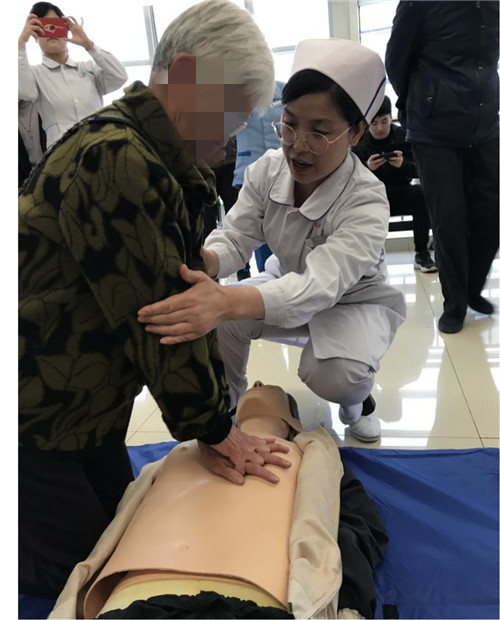 为了响应建设健康示范医院的号召,在提升自身业务水平的同时,她们又不忘将自己学到的“本领”教给住院的病陪人。3月13日下午17时,在15楼大厅由陶燕燕护士长带领科室小教员对15楼的病陪人员进行徒手心肺复苏操作培训。首先她给大家讲解了心肺复苏的重要性,然后将动作一一分解,逐一讲解,再由“小教员”现场演示,在场群众热烈鼓掌,个个称赞。大家踊跃上前亲自体验,有朝气蓬勃的小伙子,不惑之年的中年人,也有古稀之年的老奶奶,陶护士长和“小教员”手把手地教他们如何现场评估,判断意识,触摸颈动脉,心脏按压,打开气道,人工呼吸等急救操作要点和注意事项,大家认为这个“手艺”非常有用且实用,说不定哪天就派上用场,救下一条命。