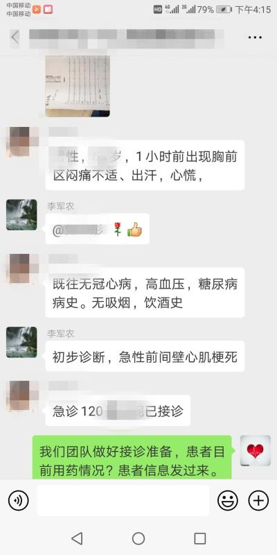 晚上20时,一名姓权的医生向总值班提供了一份心电图和检验结果,说他们正在赶往医院的路上,总值班立刻发出一个“OK”的手势,表示已经知晓并备案,准备接诊。心内科主任李军农立刻也发出了一个表情,表示愿意全力配合。