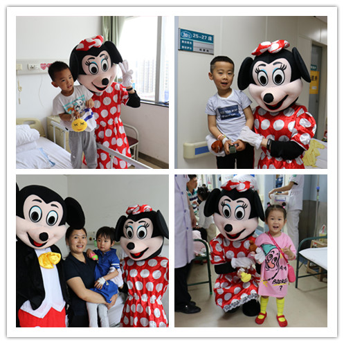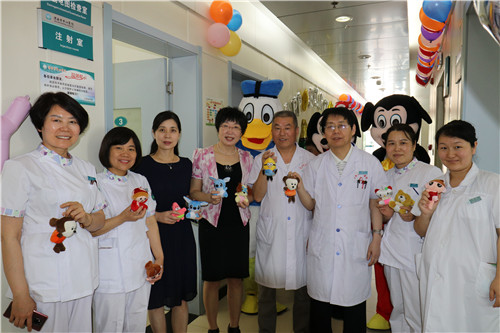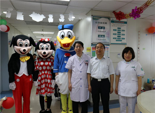 上午10:00,黄慧玲副院长、护理部高亚梅主任、张占安主任和李卿护士长、黄小红护士长等带着礼品和卡通人物唐老鸭、米奇和米妮到儿科门诊,走进输液室和候诊室给每位小朋友发放礼品,并与卡通人物和小朋友娱乐互动,合影拍照。