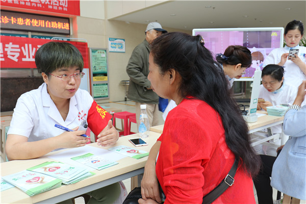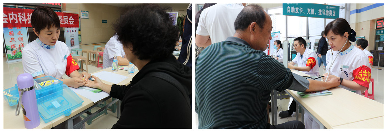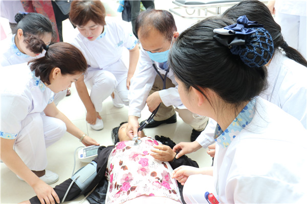 在义诊过程中一位中年女性患者突发晕厥,在场的医务人员立即给患者取平卧位,测量血压182/102mmHg,监测血糖7.3mmol/L,神经内科原向军主任给予查体,立即初步处理,患者在护士及门诊志愿者的护送下送往急诊科进一步诊治。