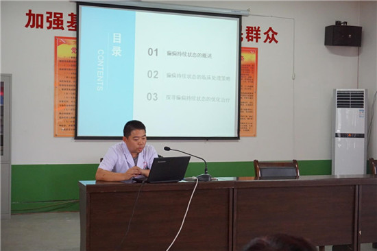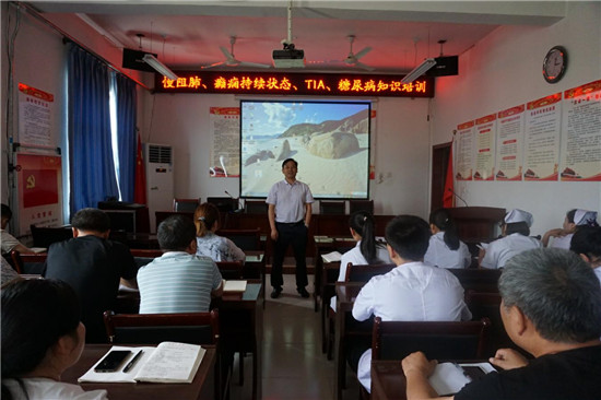 7月16日、17日下午1点至3点,呼吸内科副主任医师吴水淼、神经外科一病区副任医师杨军、2016级2名全科住院医师分别做了《让我们一起正确认识慢阻肺》、《癫痫持续状态的管理》、《Ⅱ型糖尿病患者的健康管理》及《TIA与缺血性脑卒中》专题讲座。张桥镇卫生院医务人员、党睦中心卫生院医务人员和乡医近150人参加了培训。培训结束后,针对培训内容,现场进行了理论知识考核。