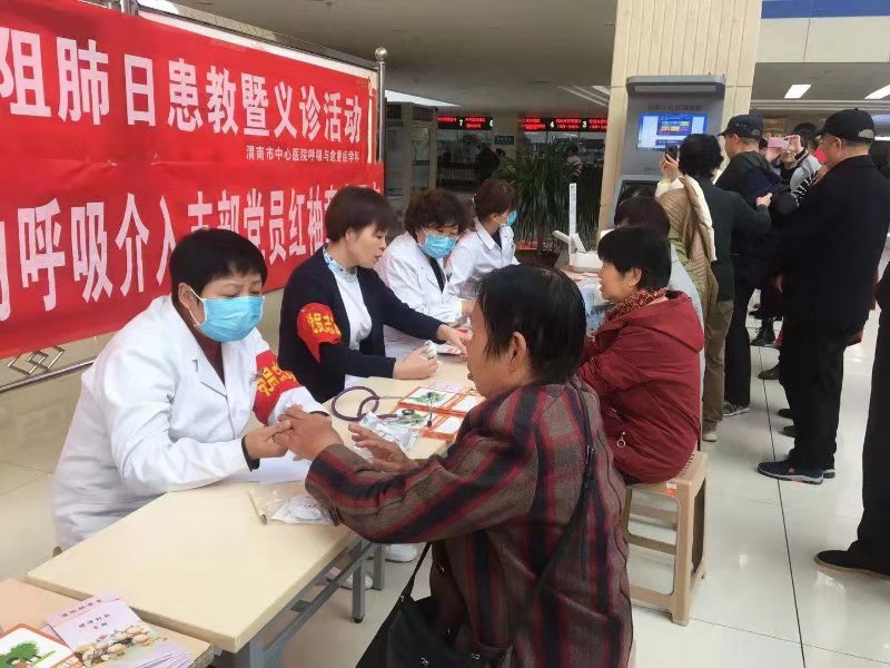 上午8:30,科室医护人员及支部党员志愿者在门诊一楼大厅为前来咨询就诊的患者提供免费义诊及咨询、普及宣传慢阻肺疾病的知识、发放科室资料及慢阻肺知识宣传手册。