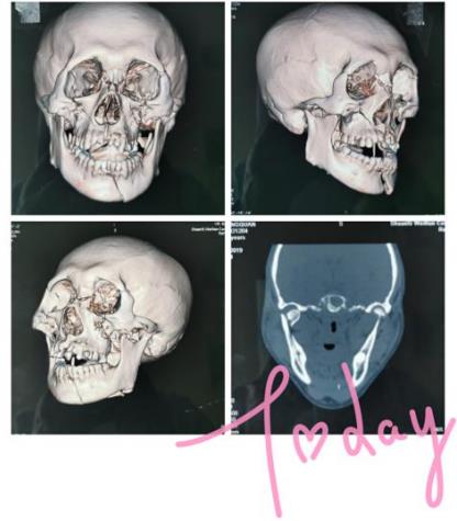口腔科李瑞春主任带领团队组织多次的疑难病例讨论和术前讨论,术前通过面部CT分析全面部骨折的部位和移位程度,确定了手术切口方式、骨折复位的顺序及固定方式,以便精确地实施手术。采访中,李瑞春主任说:“手术的难度在于没有患者之前的样貌对比,需要根据解剖关系先复位下颌骨,对比下颌骨的位置复位上颌骨,然后复位颧骨、颧弓、眶下缘和鼻眶额区,术中探查时还发现眼底壁有组织缺损,眼球下坠,最后用人工材料替代了眶底壁,支撑起眼球,使眼球恢复至正常位置。”