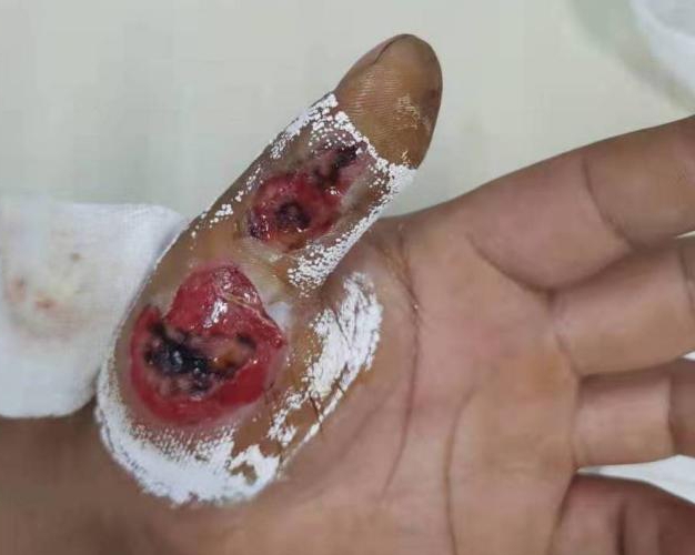 入院后对患者受伤部位立即给予冲洗清创,用葡萄糖酸钙湿敷,采血查电解质,住院期间给予清创负压吸引等治疗。出院后,在医生的建议和嘱咐下,患者根据伤口恢复情况来医院门诊换药,接受综合抗疤痕治疗,涂抹抗疤痕药、功能锻炼、佩戴弹力套等。