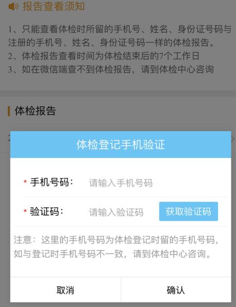 另外,在“体检助手”界面中,点击“领取报告”,填写手机号和验证码,就可以足不出户的在第一时间知晓自己的体检结果啦。