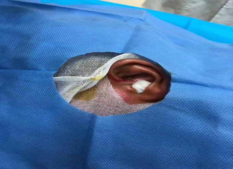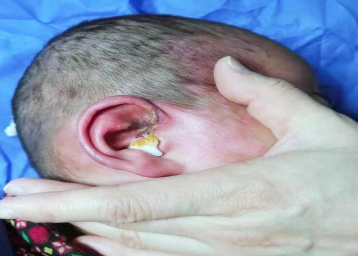 两天前由于孩子吃饭时不小心将滚烫的稀饭洒在脸上,脸颊及左耳部烫伤,因治疗效果不佳,辗转联系到王鑫医师。王鑫医师急切赶到医院,经过认真检查,并与孩子家长细致沟通,告知手术必要性及风险性,最终决定在局麻下进行左耳清创术及耳廓软骨部分去除术。