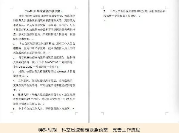 CT·MR影像科全体成员将义无反顾的坚守和担当,做好本职工作。相信在医院的统一部署下,我们以完善的措施、严格的制度、规范的流程,一定能够打赢这场没有硝烟的战斗。