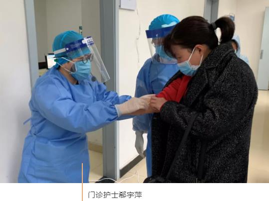郗宇萍为了方便和患者交流方便,更是腰上别着小喇叭。目前,医院的医疗物资极其短缺,去洗手间一次,意味着装备要重新更换,为了节省时间、节省隔离衣,她们尽量不喝水,这样的工作状态持续十几天,时间久了她们的嘴唇干裂出现血丝。用她们自己的话来说,工作虽然辛苦,但都无怨无悔。负责登记患者就诊信息的门诊护士文瑾穿着防护装备一坐就是一天,长时间下来,里面的衣服已被汗水大面积浸湿,考虑通风需要,发热门诊区域不能开空调,加之近期气温阴冷多风相伴,文瑾的手脚被冻得冰凉。就是在这样的条件下,她依旧克服困难,坚守岗位,从未退缩。