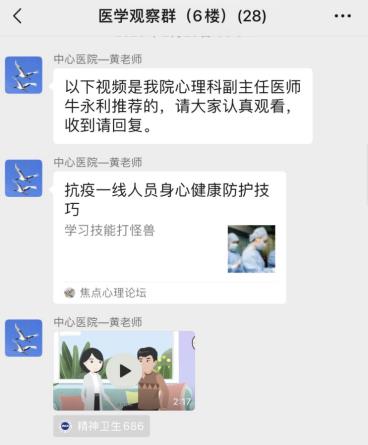 考虑到疫情期间一线医护人员工作压力大、留观人员忧虑、烦躁、恐惧等一系列心理问题,工会积极与心理科沟通,组建以心理科为牵头科室的心理微信群,发一些心理疏导视频,实时解答,为大家减压,截至目前,网络授课辅导450余人次,对一线医护人员进行电话心理疏导70余人次,对家属进行电话心理疏导3人次。