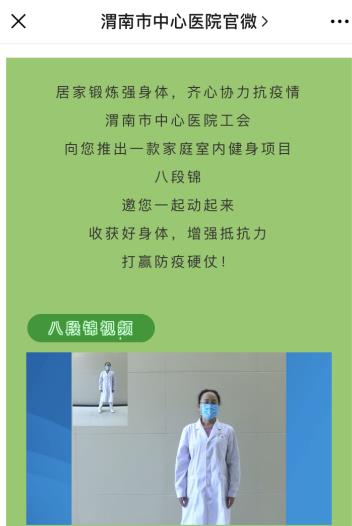 院工会时刻把职工的身心健康放在心上。抗疫特殊时期为了让广大职工在家里也能锻炼身体,增强抵抗力,不时在群里发布一些预防知识。院工会联合宣传科,录制“健身气功•八段锦”教学小视频,利用微信平台,让大家在室内做做运动,舒缓压力,放松心情,共抗疫情。