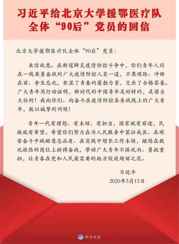 给北京大学援鄂医疗队全体“90后”党员的回信