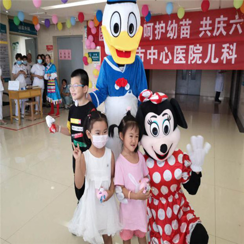 动画人物唐老鸭、米奇,米妮徐徐走来和小朋友们互动。小朋友们喜气洋洋,拉着动画人物,合影留念。医护人员、住院小朋友、家长们沉浸在欢乐的节日气氛中。