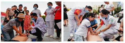 在急诊地摊现场,我科心肺复苏团队向广大市民演示了心肺复苏操作及海姆立克急救法,让现场市民直观的了解心肺复苏操作的流程,并通过发放相关资料、邀请现场市民及小朋友们亲自动手操作,进行一对一指导,做到边操作边讲解,手把手纠正,使大家能切身掌握心肺复苏操作技能。