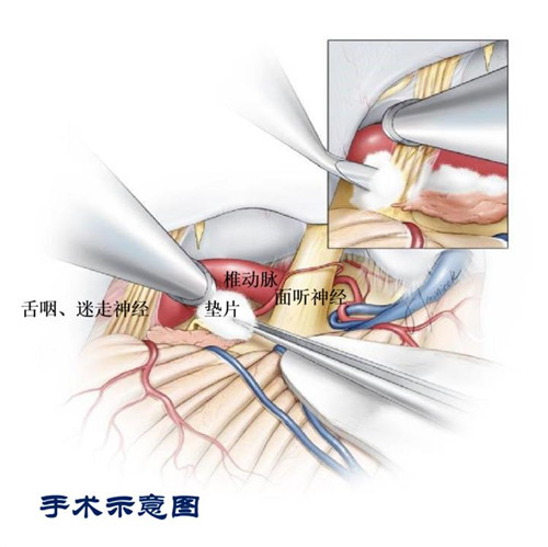 手术为耳后开窗,骨窗大小约3厘米,由脑组织间隙进入,准确的找到压迫延髓左侧的血管,将血管和延髓分离开,并用垫片隔开。因不破坏神经和血管,手术后并发症极小,主要是神经牵拉带来的可逆性症状,包括:听力下降、面瘫、眩晕、声音嘶哑、饮水呛咳。即使出现这些症状,基本上术后1-2月可自行恢复。