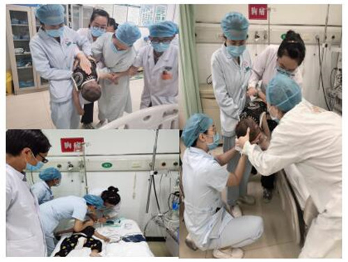猝不及防,上午的培训刚结束,中午急诊大厅突然传来呼救声,“快来救救我的孩子,我的孩子吃东西呛住了......”医护人员迅速反应,接过孩子,触摸无颈动脉搏动、无自主呼吸、意识丧失、颜面青紫,在场医护人员立即为患儿实施海姆立克急救法。约5分钟后,孩子意识较前好转,面色也较前改善,患儿呕吐出少量食物残渣,但仍呼吸困难,随即给患儿行气管插管、心电监测、建立静脉通路等抢救措施,约半个小时后,患儿生命体征趋于平稳。考虑到气管内可能仍有少量异物,经儿科及支气管镜室医师会诊后,建议转上级医院进一步治疗,经了解,患儿已经转危为安。