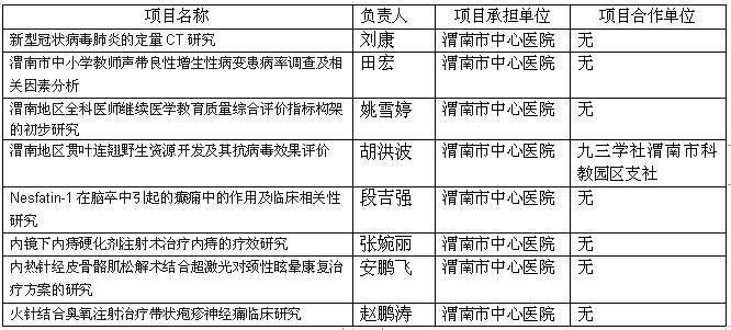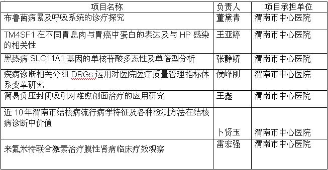 2020年,医院《新型冠状病毒肺炎的定量CT研究》等8项科研课题在“2020年度渭南市科技发展计划”中获准立项。《布鲁菌病累及呼吸系统的诊疗探究》等7项科研课题获批“2020年度MILAN.COM科技发展计划”支持。截止2020年10月10日,医院组织申报《经内镜逆行阑尾炎治疗术》等9项陕西省卫生健康委“2020年度陕西省卫生健康科研项目”,并且均对项目标书组织业内专家评审及优化上报。这标志着我院2020年纵向科研项目的年立项数再创历史新高。