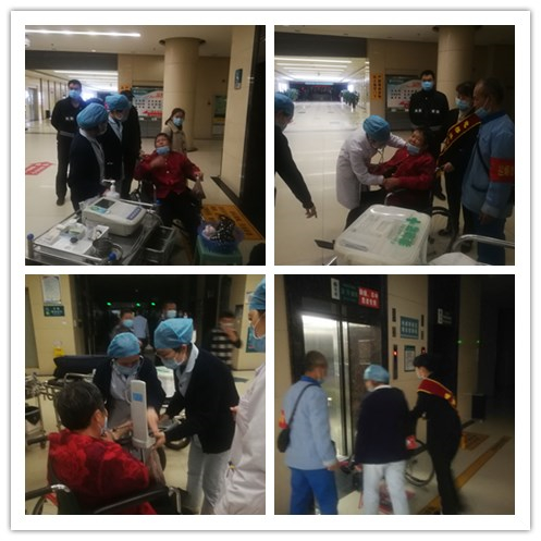 10月24日晚18时10分许,我院急诊科值班电话传来院巡逻队员颛育急促的求救声音。闻讯后,急诊科二线值班医师王二宁,护士尚小丽、冯梦鸽迅速携带应急急救医疗设施设备奔赴急救现场。经王二宁医师3人组成的急救小组问诊、查体、测量血压,看到老人收缩压为180毫米/汞注后,建议老人去急诊科做进一步检查治疗,以排除老人有卒中、骨折等其他风险隐患。老人讲:“刚才可能因为急着给住院的孙子送饭,等电梯时两腿一软,就摔倒了,多亏在场的这么多的好心人给我帮忙,真的太感谢了,你们不亏是大医院教育出来的,孙子还在十二楼儿科住院,等着吃饭呢,我现在感觉很好了,就不再麻烦大家了”鉴于老人的再三坚持,经过对老人体征的综合评估,王二宁医师安排护士冯梦鸽同电梯员护送老人去儿科病区,并电话叮嘱儿科值班医护人员,让家属给老人服用些降压药,过半小时后再为老人复查血压,若老人有不适症状,请及时联系急诊科。老人很是感动,临走时,在轮椅上连连向为她提供帮助的急诊科医护人员和巡逻队员、电梯员、保洁员鞠躬致谢。