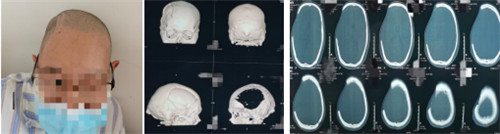 图3.术后外貌,术后颅骨CT平扫及颅骨CT三维成像