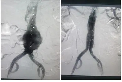 胸心外科姜永红副主任接诊该患者后,考虑患者病情危急,随时有腹主动脉瘤破裂危险,立即上报医务科,启动MDT团队。次日胸心外科团队在介入科及相关科室支持下成功完成医院首例腹主动脉瘤覆膜支架腔内隔绝术。