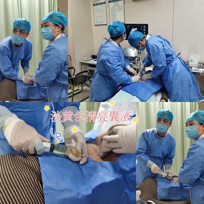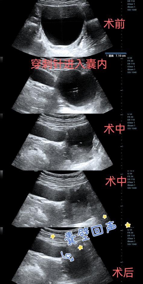 超声可敏感的检出囊肿并用于囊肿的诊断和复查,应用超声引导下囊肿穿刺抽液并硬化囊壁已成为目前临床微创治疗囊肿的首选方案。该技术主要是使囊腔缩小或闭合,达到减轻和消除相应临床症状。