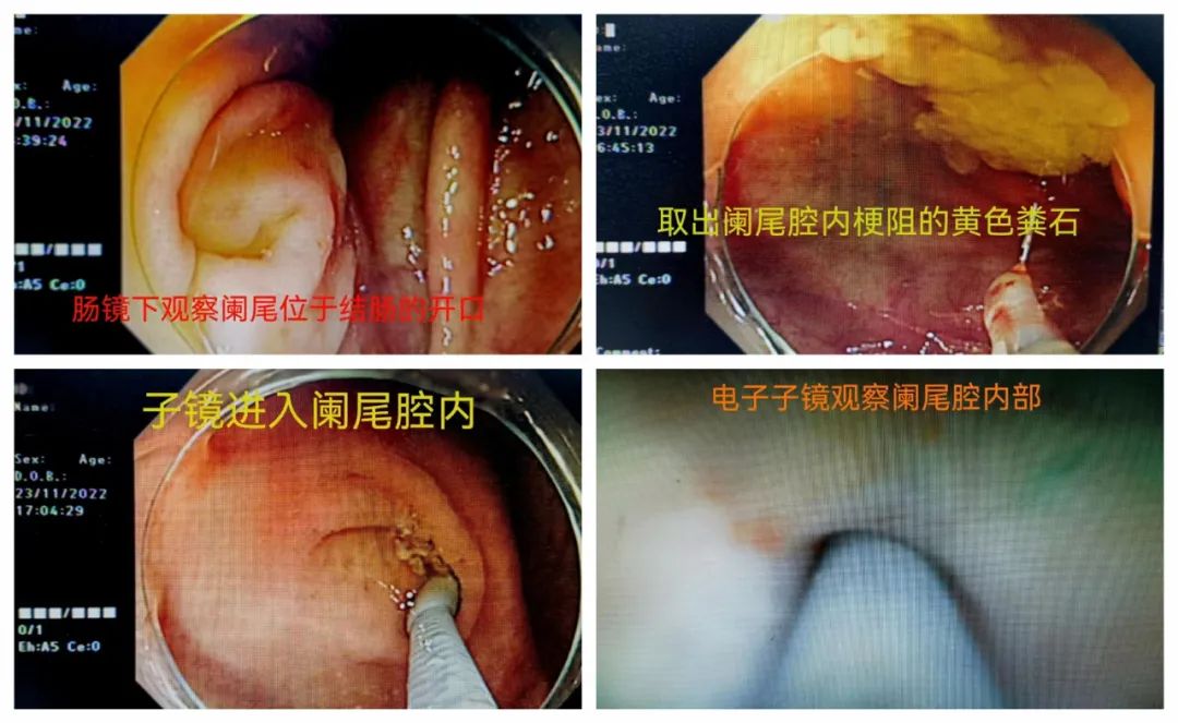 患者张某,女性,55岁,因餐后出现腹痛不适,来市中心医院就诊,经过B超、CT等检查,提示阑尾炎并阑尾腔粪石。曹鹏熟练开展内镜下逆行阑尾炎治疗术(ERAT),从根本上颠覆了临床对急性阑尾炎“一切了之”的传统做法。他会诊后表示,该患者具有内镜下逆行阑尾炎治疗术(ERAT)适应症。通过结肠镜经肛门逆行至回盲部,探查到阑尾开口,并结合ERCP经口胆道镜取得灵感,创新性将电子胆道子镜自结肠镜活检孔道送入阑尾腔内,直视下观察到患者阑尾腔内情况。术中看到张女士阑尾腔内大量粪石,周围黏膜充血和水肿,经过抗生素反复冲洗,粪石流出,手术仅用20多分钟,几乎无创,患者术后疼痛迅速缓解,体表无创口,可自由活动。