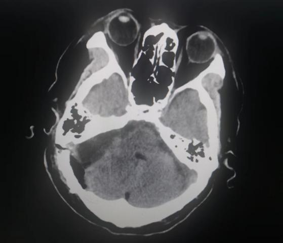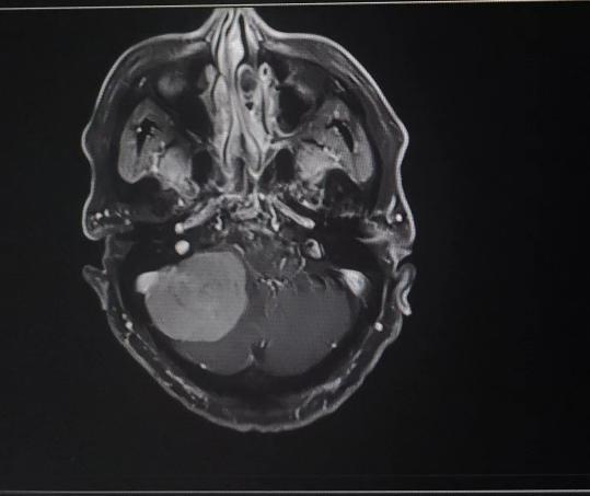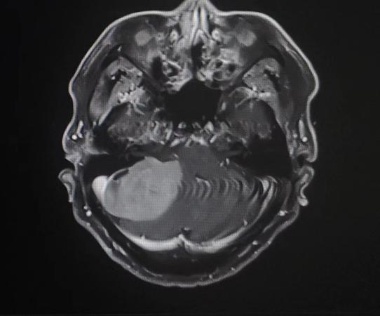 患者入院后,头颅MR检查后发现,小脑右侧长了巨大肿瘤,直径约6公分,患者家属收到不小的惊吓。患者4年前曾做过一次头颅核磁共振,当时肿瘤较小,考虑到患者已经88岁,家人还是决定保守观察,没想到如今,它已经长大到足足有一个土豆那么大,而且患者头晕较重,反复恶心、呕吐,卧床不起,因此必须进行手术,才能解决患者病症。