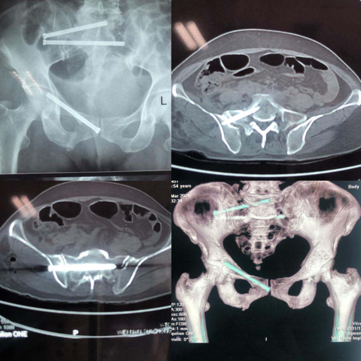 患者为一位54岁的女性,被重物砸伤2小时后来院诊治,经检查发现患者骨盆骨折(Ti1eB3型)、右侧骶骨骨折(denis2区)、双侧耻骨上下支骨折等。