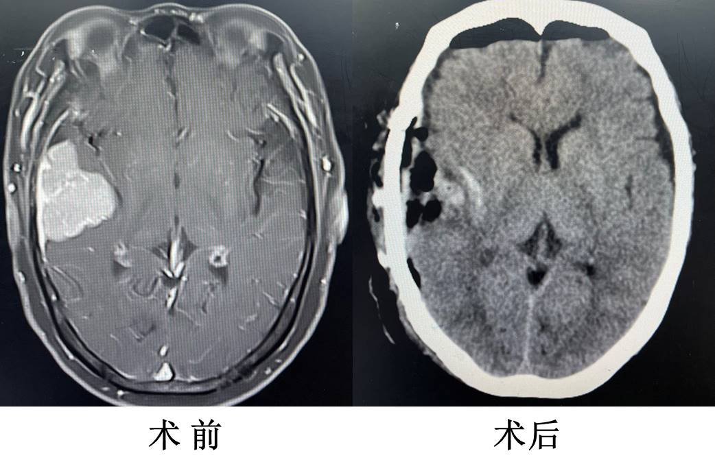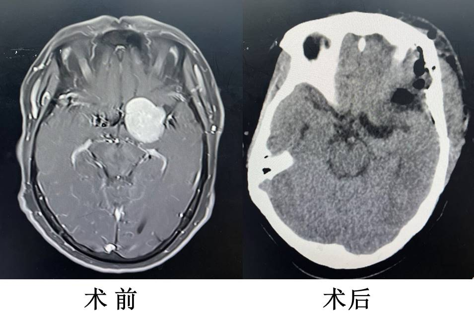 患者头痛困扰半年余,慕名来院就诊,经一系列检查确诊巨大蝶骨嵴内侧脑膜瘤。术前充分准备行显微镜下肿瘤全切。手术过程中应用新引进的神经外科手术重磅利器——神经外科手术超声吸引装置CUSA,肿瘤切除顺利,术后患者快速康复,次日下床活动,四肢活动灵便。CUSA切除肿瘤做到缩短手术时间的同时,不损伤周围血管神经,减少术中血管神经损伤风险。