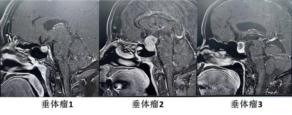 三例患者均为垂体腺瘤。一例为生长激素功能型垂体瘤,生长激素超高、患者面容改变、骨骼宽大,手术后经复查,生长激素下降至正常范围。一例患者因视力下降,于眼科就诊多次,发现垂体瘤后来神经外科就诊,术后自觉视物明显清晰,效果满意。一例患者头痛困扰多年,检查后发现鞍内-鞍上型无功能垂体瘤,经手术治疗后症状明显好转。