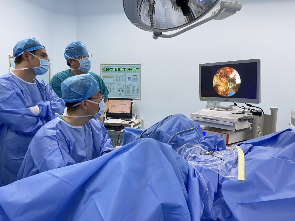 随后,为一例36岁的结石患者,使用电子软输尿管镜配合150μm光纤,清晰观察到结石,掺铥光纤激光治疗机很快将结石击碎,手术时间仅半小时安全解决了患者病痛,实现精准治疗。