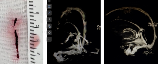 患者转入神经内科后,行腰穿及核磁共振检查,考虑患者颅内静脉窦广泛血栓形成,病情危重。患者有行颅内静脉窦造影及取栓指征,与患者家属商议后,第一时间脑血管造影,明确颅内静脉窦血栓,并给与颅内静脉窦取栓,5小时后患者静脉窦再通,成功回病房进一步抗凝药物治疗。