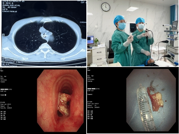 考虑到异物存在金属的可能性,嵌入时间过长会导致气管漏,有出血等严重并发症风险,康军英主任决定立即为患者行急诊气管镜下异物取出术,内镜室吴水淼主任与患者家属充分沟通,薛冬冬护士长为患者协调科室床位,准备完善后随即为患者行气管镜检查。