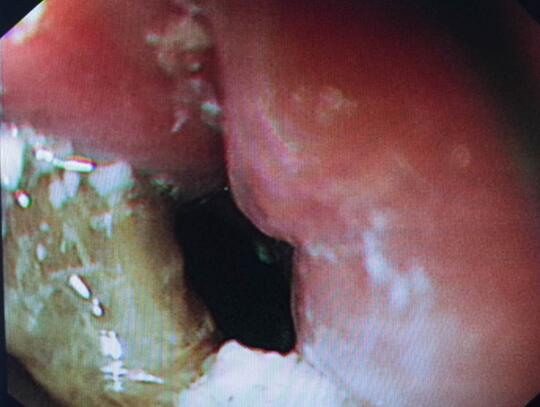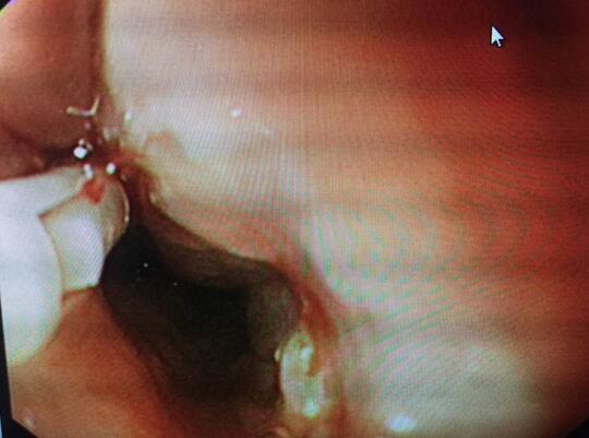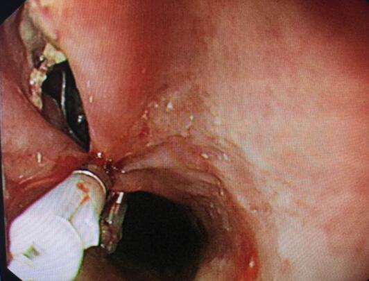 内镜中心王莹副主任考虑到患者病情复杂且高龄,不具备急诊外科手术条件,在确保患者安全情况下行内镜下异物钳取术、钛夹封闭损伤治疗。术中观察到梭形枣核嵌顿于患者食管上端,一侧食管壁可见纵形全层伤口,损伤非常严重。王主任克服困难,以她熟练的操作最终将异物顺利取出。