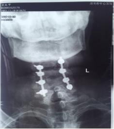 11月13日行手术治疗,后前路联合手术。先行颈后路切开,颈3-6椎体侧块螺钉固定,再行前路颈4.5间盘以及颈前脓液清理,椎间隙植骨融合术。术中见颈4.5椎间隙前缘被一直径1.5㎝肿物包裹,打开后,可见其内少许米汤样脓性液,肿块壁为脓性物。间盘内充填相同物,上、下缘软骨板漂浮,翘起,上下椎体相邻面骨质酥脆,同时后缘有大量不良增生物,骨钩分离后,可见自颈5椎体后缘,流出同样的米汤样脓液。彻底清理脓性液,充分刮除椎体不良骨质。大量生理盐水冲洗,取三面皮质髂骨块置于椎间隙,敲紧。术后前侧放引流管于脓腔间隙。术后留置3.5天。术中留取的脓液细菌培养仍为阴性,刮出的椎间盘及囊壁病检结果显示为化脓性炎表现。术后继续抗生素治疗,患者体温正常,四肢肌力改善明显,下肢肌力术后第2天恢复至2级。上肢肌力4级弱。躯干部位感觉平面下降至乳头以远,大小便功能改善不明显。