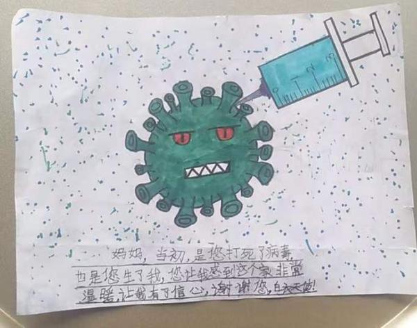我们负责小区核酸检测工作,第一天检测完成后,一位小朋友送来了他自己画的手抄报,那不太娴熟的画法和颜色的搭配却是小朋友对于我们的信任和工作鼓励最好的印证。他用最简单的语言表达了对我们一线抗疫人员的喜欢和支持,让我们对接下来的工作更有动力和信心。晚上结束一天的工作后,收到我自己孩子的画,看到那些文字,潸然泪下,温暖我的内心。隔着屏幕,我对孩子说:“相信妈妈,相信国家,等抗疫胜利结束,妈妈很快就会回来!”