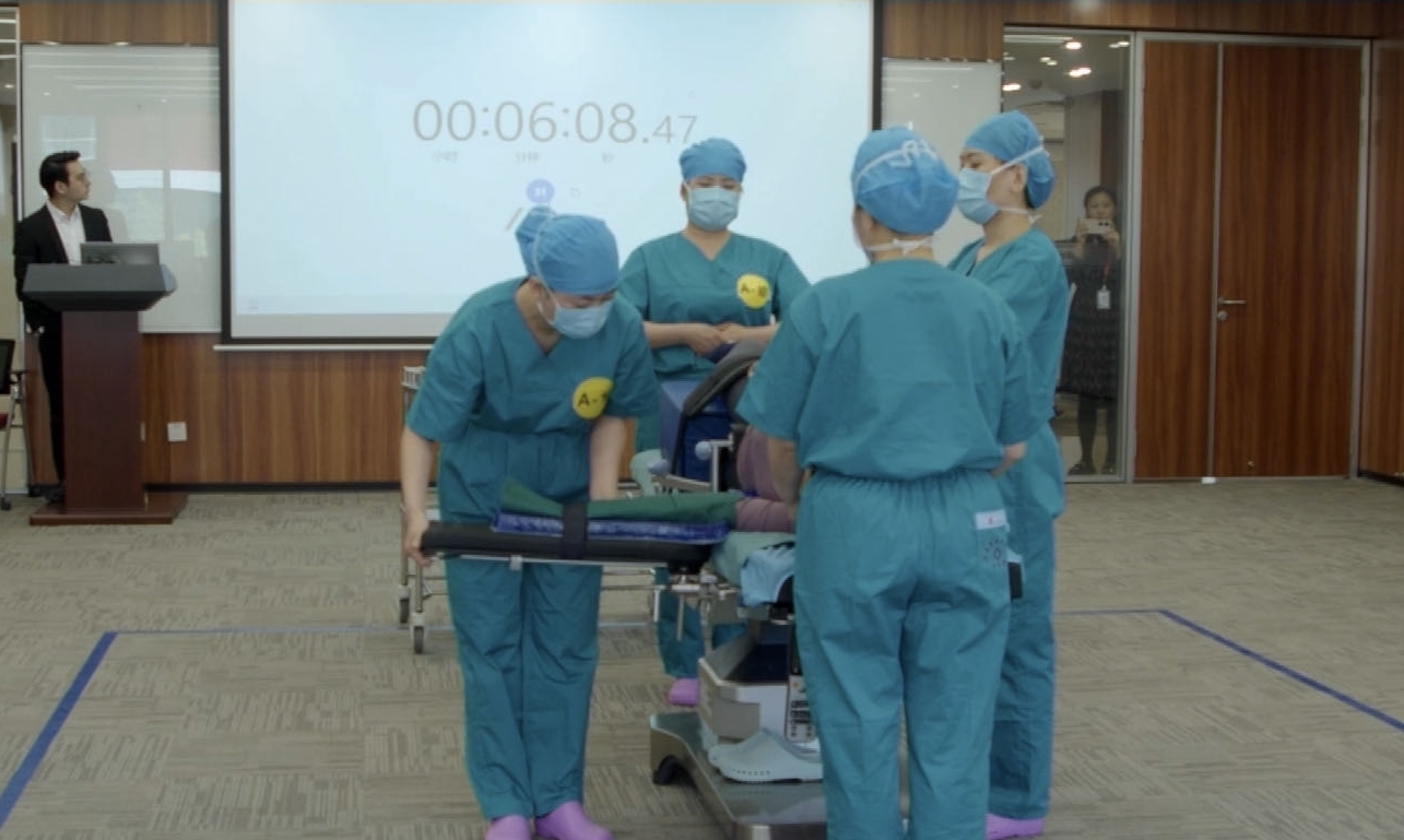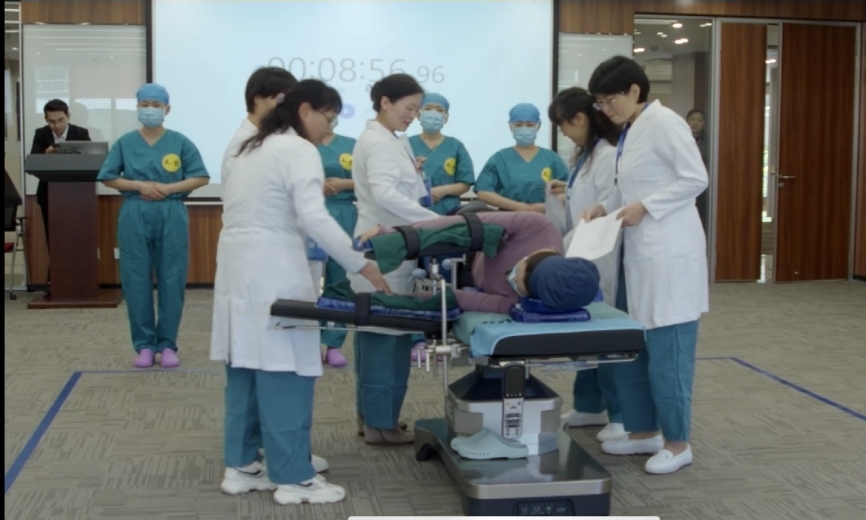 比赛中,医院参赛团队现场抽取案例,选手们正确评估,动作娴熟、沉着冷静、配合默契,展示了市中心医院麻醉手术科护理团队手术体位安置的专业性及规范性。