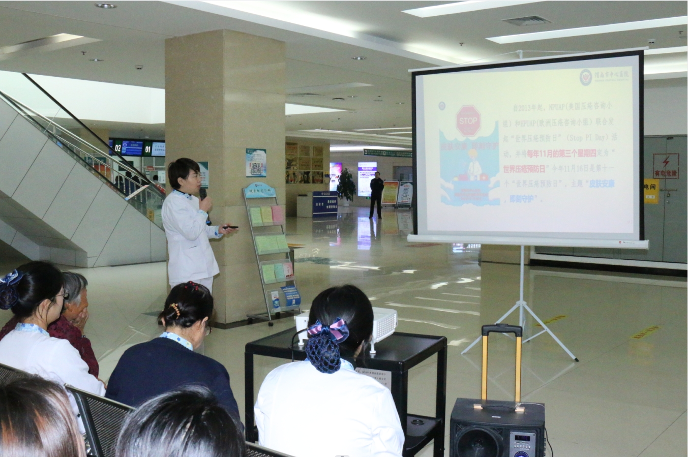 为普及压力性损伤的预防和基本护理方法,使更多的人了解和关注压力性损伤,有效预防压力性损伤发生,11月16日,世界压疮预防日来临之际,市中心医院伤口造口护理团队在普通外科门诊举办以“皮肤安康、即刻守护”为主题的科普宣传活动。各科室皮肤联络员和压疮患者四十余人参加。活动由普通外科张少青护士长主持。