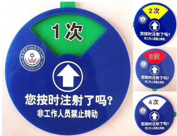 胰岛素注射转盘,是内分泌科护理团队针对患者实际需求精心研发的实用工具。转盘分为四个清晰标记的区域,分别对应“1次”“2次”“3次”和“4次”胰岛素注射次数,覆盖了患者一天中可能需要的所有注射场景。护士只需根据医嘱轻松转动转盘,即可准确调整患者的注射计划,各班护士在查对及交接班时也能一目了然,大大提高了工作效率和准确性。