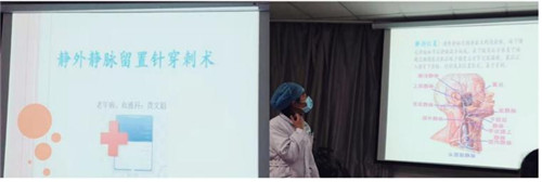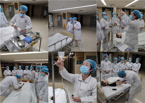 为保证培训效果,科室采取了多种培训形式,如微信群发放课件及操作流程提前预习,现场演示加手把手指导,培训现场循环播放视频,两人结对互相练习。陶燕燕护士长全程跟踪培训情况,每个项目随机设置模拟情景抽考各层护士,锻炼护理人员的应变能力和人文关怀意识,重点项目的理论知识逐人口头提问考核。示教室里你练我查,你背我听,学习气氛积极而浓厚。