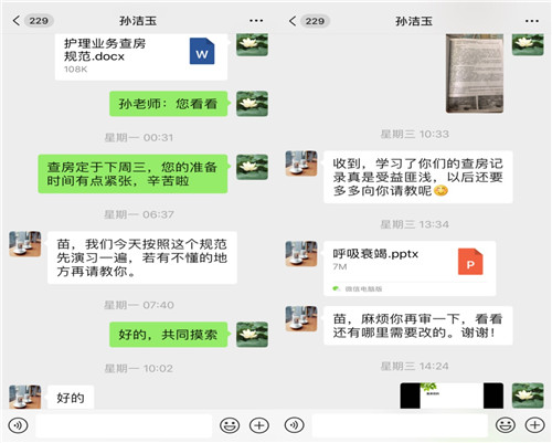 6.总结与评价:李苗组长对本次护理业务查房的亮点给予肯定并指出不足和改进方向,同时和大家一起探讨新修订的《护理业务查房规范》,明确了查房的记录格式包括:查房时间、主持人、参加人员、记录人员、查房题目、病例属性及查房内容(a患者基本信息:姓名、床号、年龄、病例号、诊断;b病情汇报与护理计划介绍;c护理查体与点评;d护理问题讨论; e相关知识学习;f提问与补充意见;g总结与评价)。要求各位联络员在自己所在科室协助护士长做好护理业务查房工作,力求通过每一次查房拓宽知识广度,增强解决危重疑难问题的能力,提高护理人员理论水平及综合分析能力。
