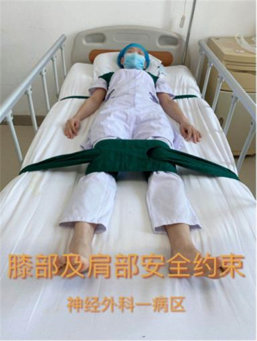 由于病情等原因,患者烦躁不安,极易发生坠床等意外。为确保患者安全,大家集思广益,制作符合神经外科患者使用的约束带,与传统的约束带相比,这种约束方法更加安全稳定舒适,避免了病人自残、自伤,防止了意外的发生,使各项治疗护理能够顺利进行。