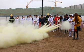 在最后一个现场教学环节,保卫科工作人员将大家带到空地进行模拟演练,并为大家示范了窒息灭火法和干粉灭火器灭火法,指导大家使用消防器材进行灭火。