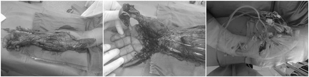 患者生命体征稳定后转至骨二科进行进一步治疗。副主任医师武东升接诊患者,并立刻对伤情进行了处理,在取除敷料后,患者上肢自肘以上5cm以远端皮肤剥脱,直至手掌背部,肌肉组织撕裂成絮状,伤处表面有大量泥沙样异物覆盖,皮肤撕裂呈絮状。拇指表面的软组织剥脱,残余部分指骨,其余手指末梢无血运。患者的手部感觉明显减退,不能活动,肘关节、腕关节亦不能活动。